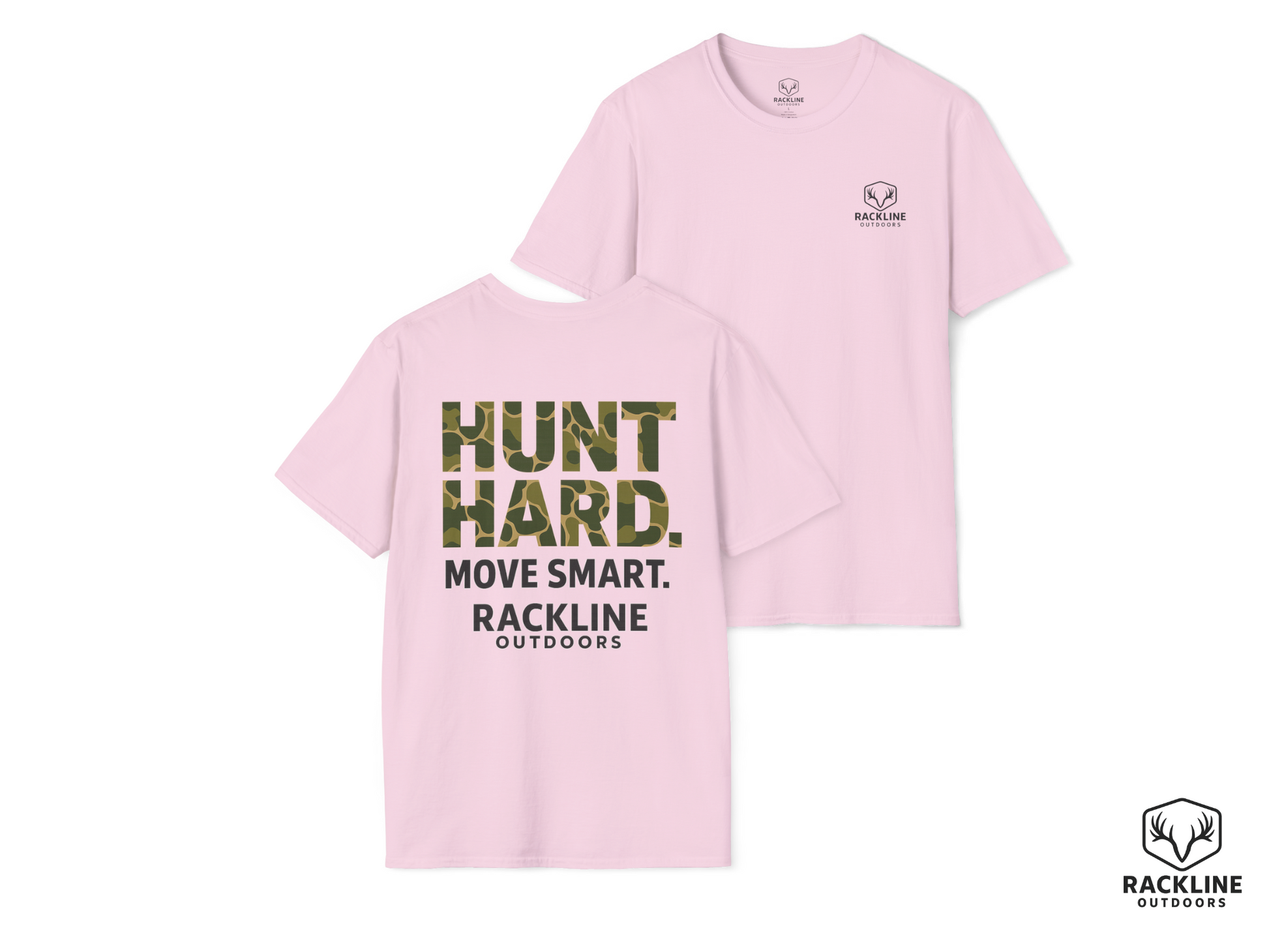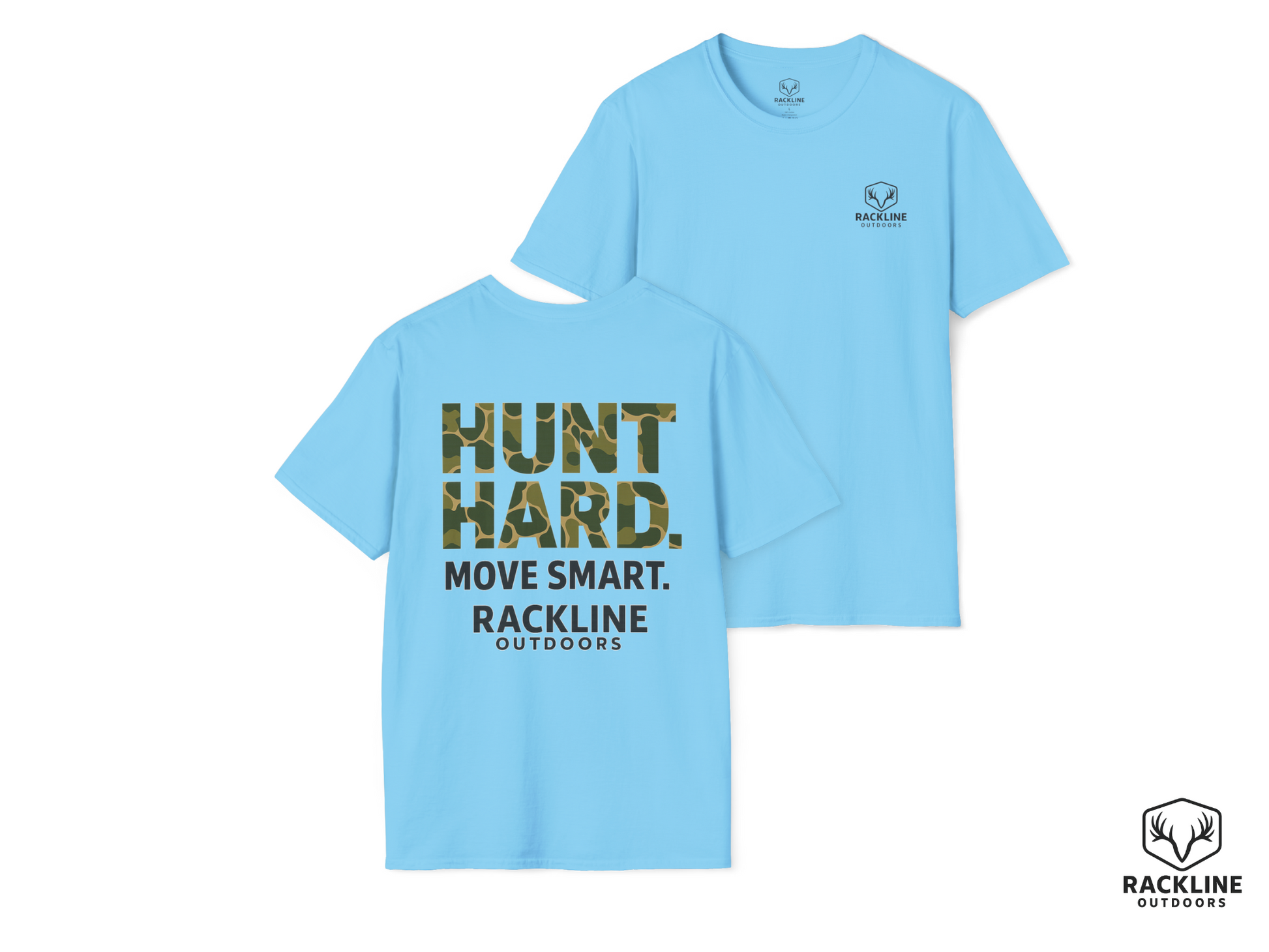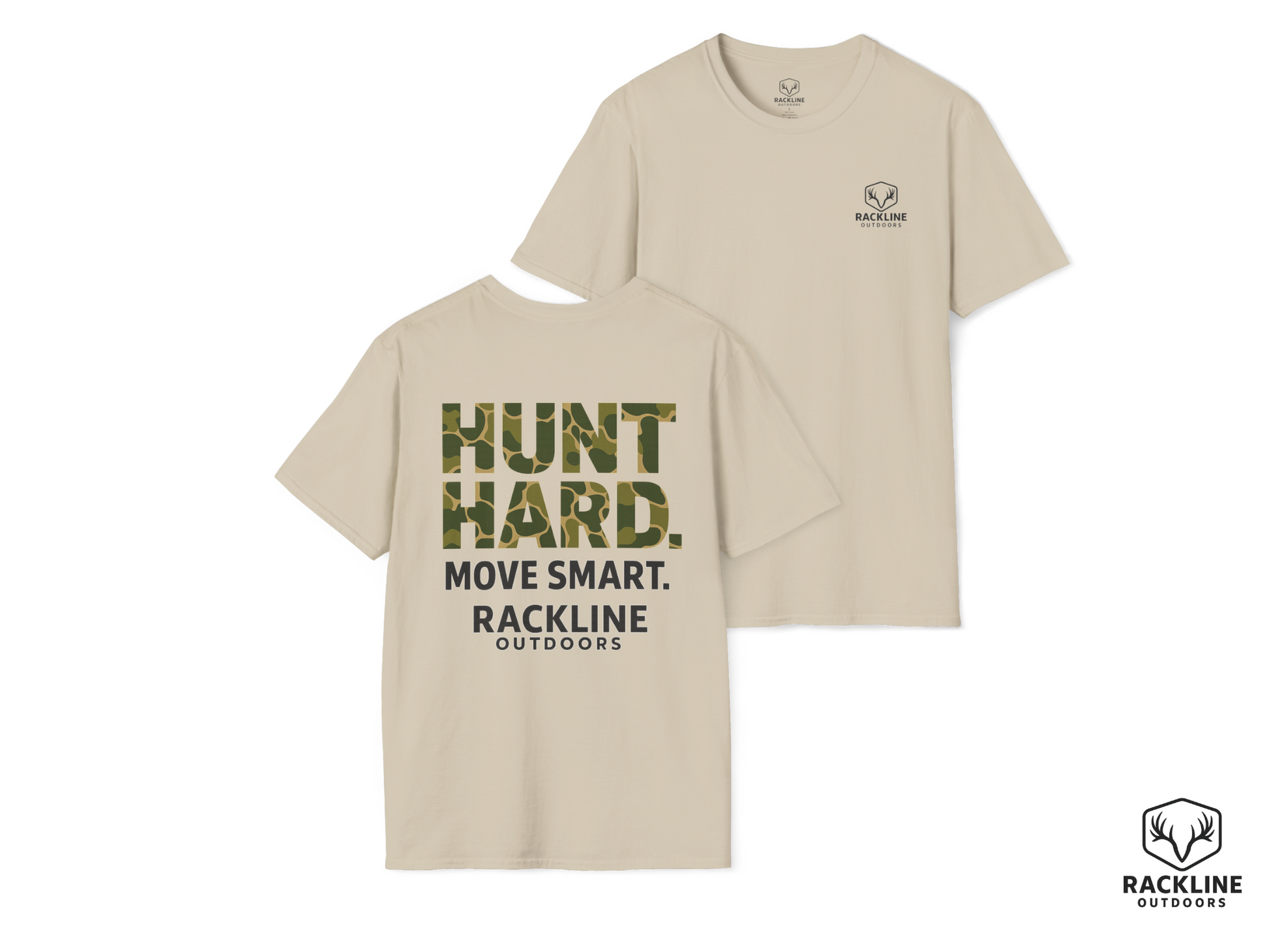 This is the tee that speaks for itself — a clean, classic design stamped with the RackLine Outdoors antler badge and our core creed: Move Smart. Hunt Hard.