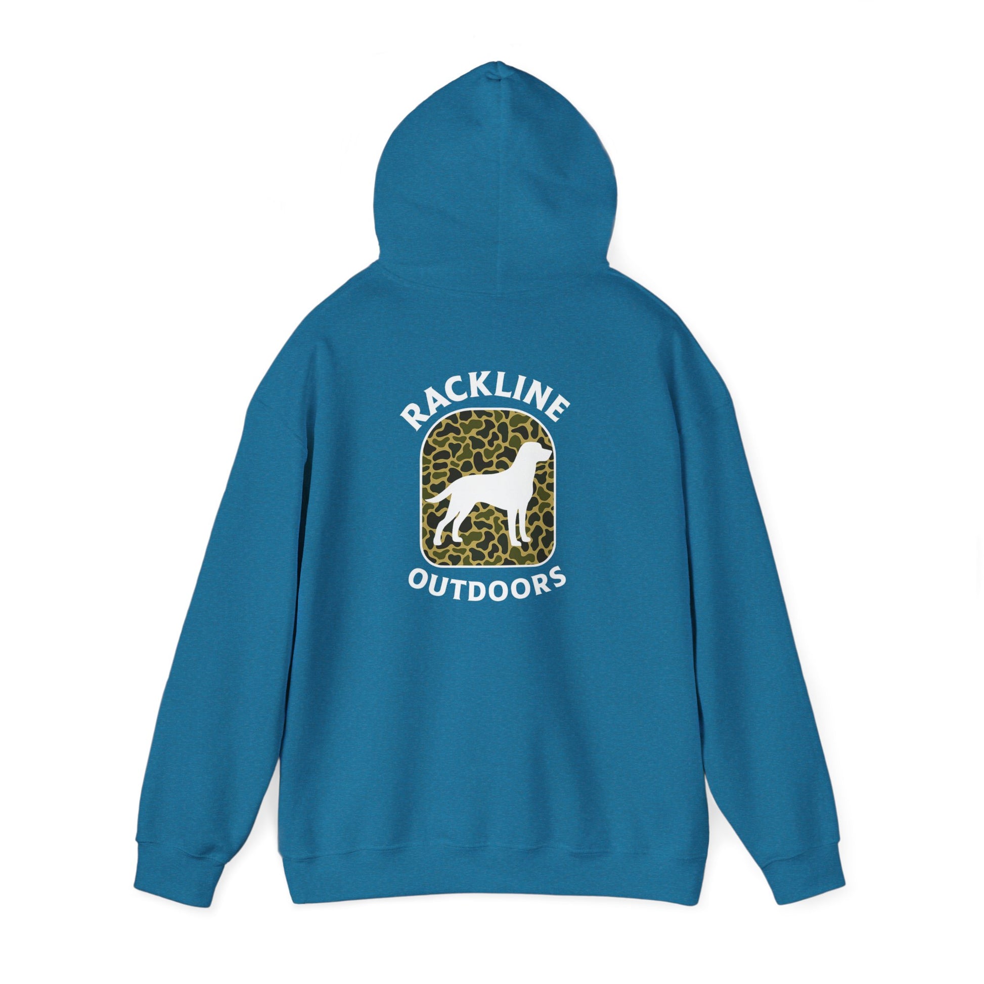 Bring heritage style to the hunt with the RackLine Retro Dog Badge Hoodie. Inspired by our old-school camo vibe, this hoodie features the Retro Dog Badge design that celebrates man’s best hunting partner. Printed bold on a soft, mid-weight cotton/poly blend, it’s built for comfort whether you’re chasing birds, scouting whitetails, or relaxing after a long day outdoors.